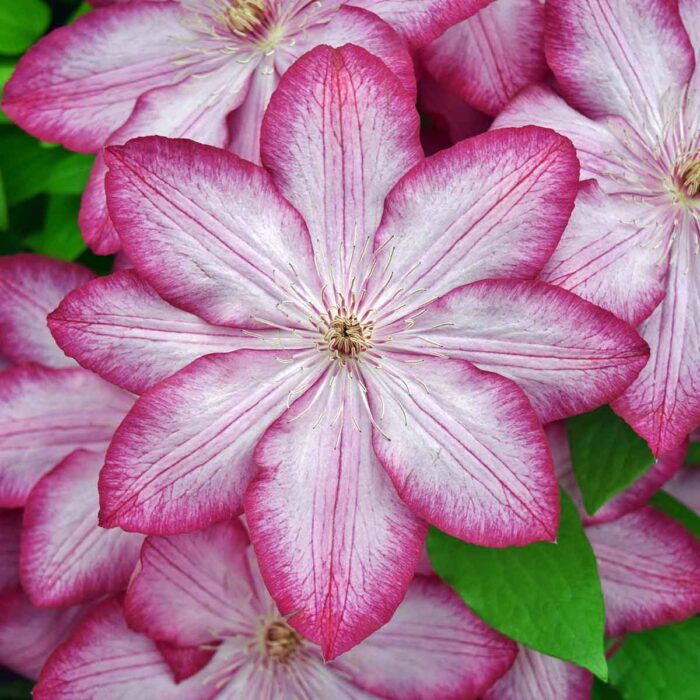 Clematis LIBERTY este o clematita frumoasa, cu flori mari, cu petale rotunjite, bordurate cu rosu-ciclam. Introdusa in anul 2014.
